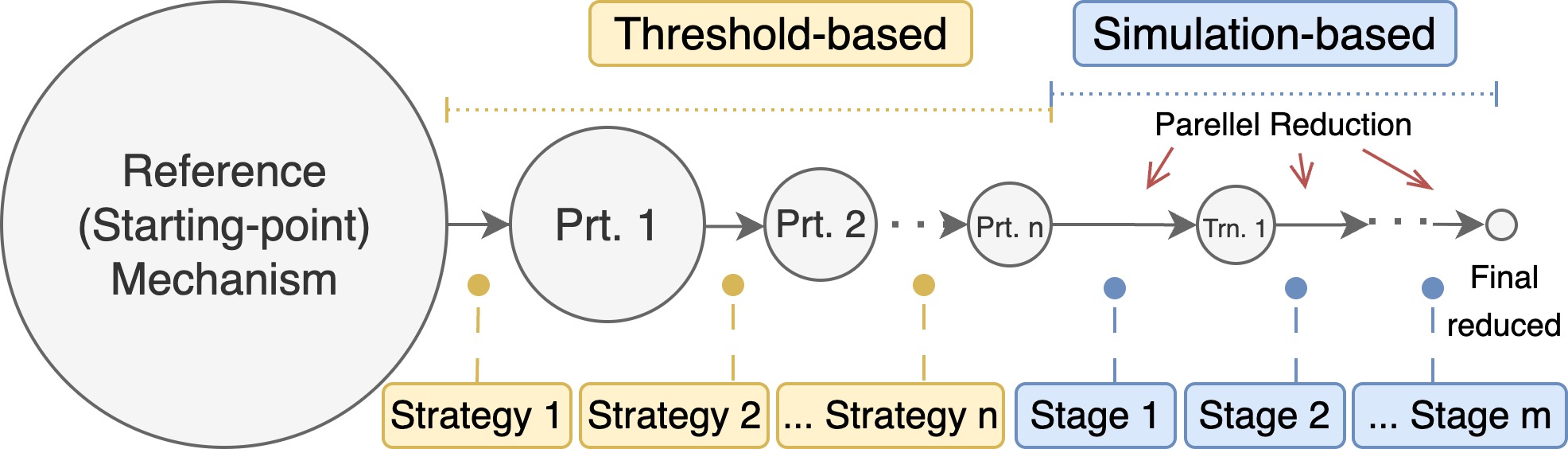 - Threshold-based reduction (TBR) – fast, rule-driven pruning using physical, structural, and kinetic thresholds to trim large mechanisms.